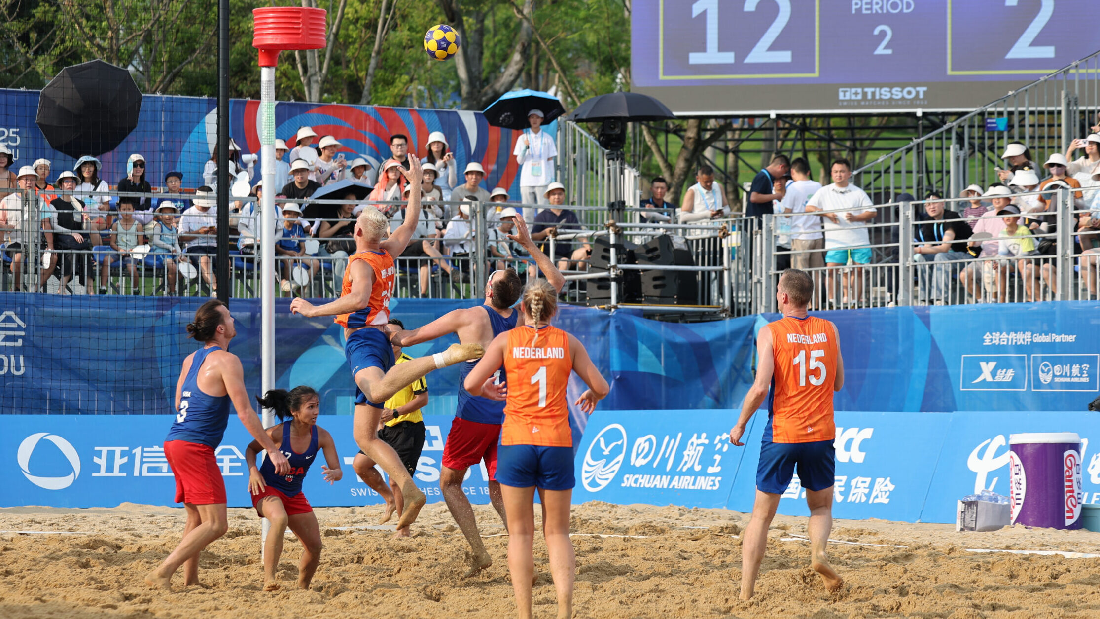 Beach Korfball is a new and exciting discipline of Korfball played 4×4 on a beach-volleyball sized court